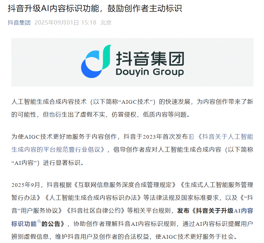 - 抖音集团发布《抖音关于升级 AI 内容标识功能的公告》