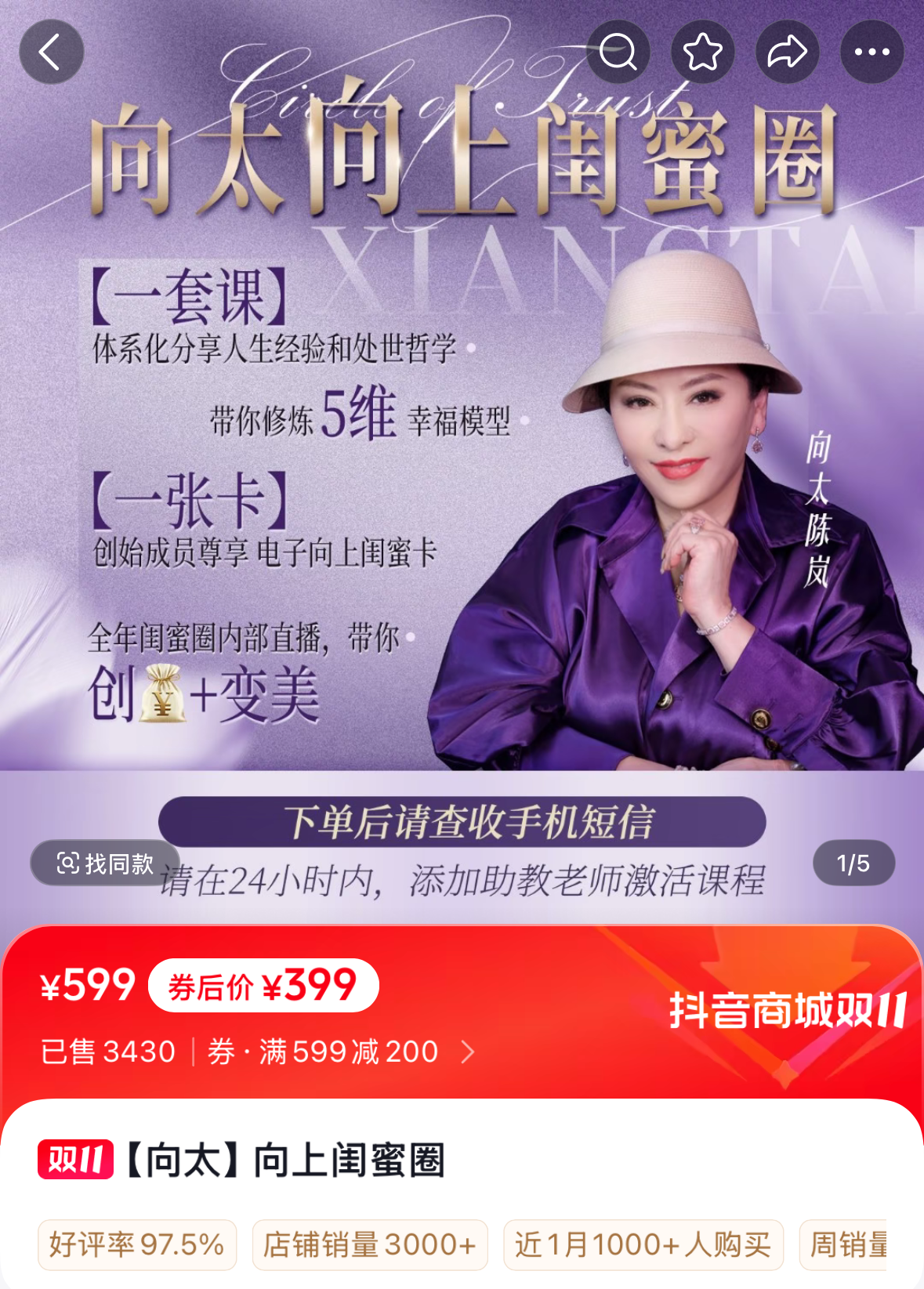 2025 年09月初,继吴彦祖、王力宏、汪峰后,68 岁的陈岚(向太)推出直播课程《向太向上闺蜜圈》,定价 399 元,并配套推出“电子闺蜜卡”,宣称可提供圈层连接与深度陪伴等权益。课程上线后在抖音、小红书、视频号等平台销售额突破 200 万元,但因课程内容较短、权益描述模糊,引发部分用户质疑。该事件体现出“明星卖课”正成为知识付费的新趋势。相比直播带货,知识付费具有“无库存、可重复销售”的优势,但随着名人入场,课程质量、内容真实性与用户信任问题也愈加突出。