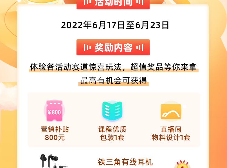报名参与活动的达人只需在活动期间完成课程上传并使用平台任意一种营销工具,即可获得参赛资格。