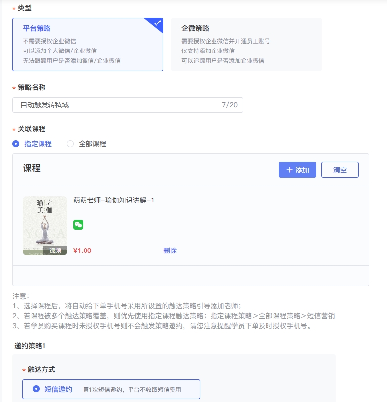 海豚知道已上线短信自动触达策略功能,老师可自定义配置短信发送策略,配置后学员开始学习即触发短信自动发送,短信内容老师可自行编辑;无需跳转第三方平台发送短信,在海豚知道内即可完成看课交付+私域留存。