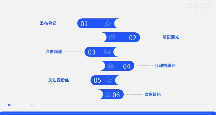 发布笔记→笔记曝光→点击阅读→互动赞藏评→关注变粉丝→课程转化。